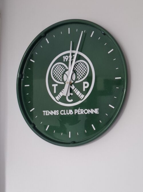 Accessoire décoratif pour espaces FFT Le modèle ZENITH est une horloge murale personnalisée de 45 cm de diamètre, conçue pour compléter harmonieusement la gamme de mobilier et d’objets décoratifs destinée aux clubs de tennis et de padel, aux espaces FFT et aux zones d’accueil.